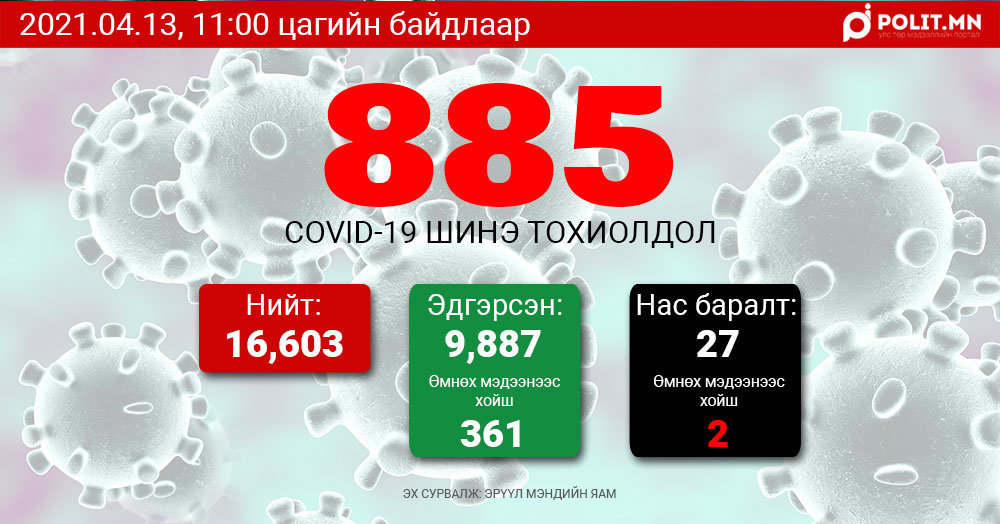Коронавируст халдварыг илрүүлэхээр сүүлийн хоногт улсын хэмжээнд хийсэн шинжилгээний хариуг 11:00 цагт /2021.04.13/ танилцууллаа. Улсын хэмжээнд даваа гаригт 704 хүнээс халдвар илэрсэн бол өнөөдөр 885 тохиолдол бүртгэгдэж, хоёр хүн нас баржээ.