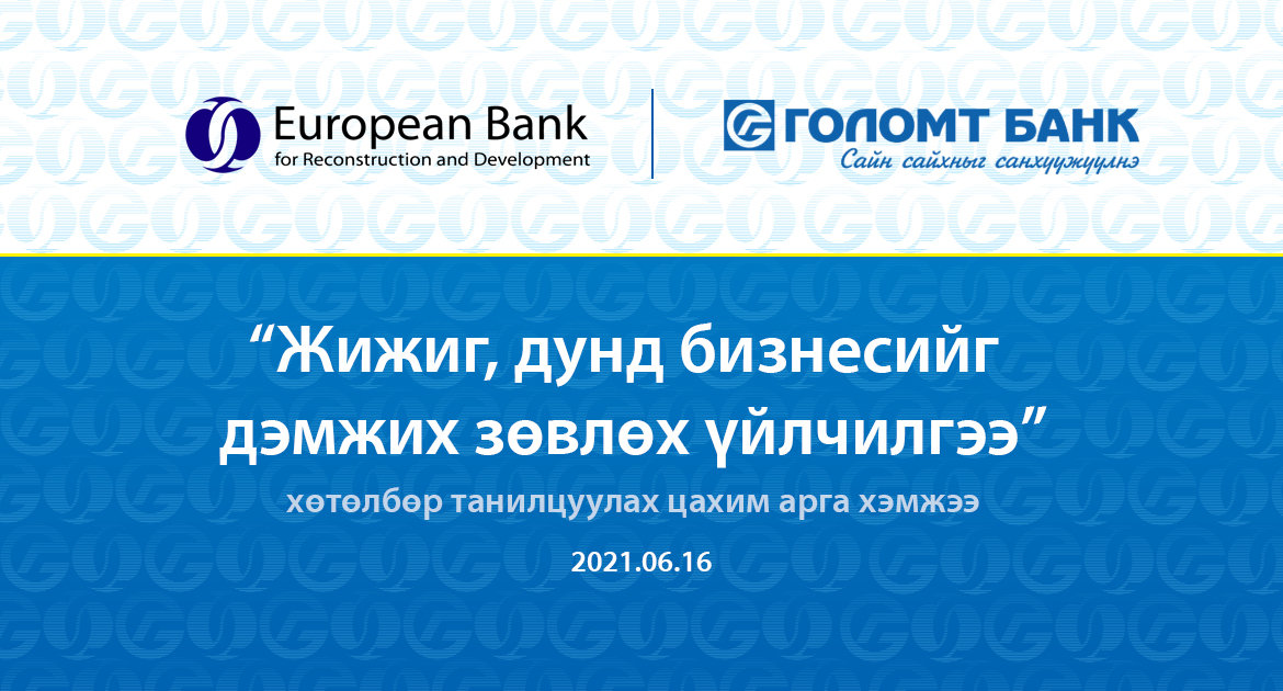 Голомт банк болон Европын сэргээн босголт хөгжлийн банк хамтран “Жижиг, дунд бизнесийг дэмжих зөвлөх үйлчилгээ” хөтөлбөрийг танилцуулах цахим арга хэмжээг энэ сарын 16-ны өдөр зохион байгууллаа. Тус арга хэмжээнд нийслэлд үйл ажиллагаа явуулдаг жижиг дунд бизнес эрхлэгч байгууллагуудын удирдлагууд оролцож, 20 гаруй ААН болон Голомт банкны харилцагчдад зориулан шинээр бий болж буй зөвлөх үйлчилгээний талаарх дэлгэрэнгүй мэдээллийг хүргэлээ.