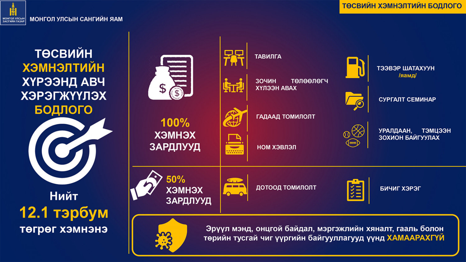 Төр зардлаа хэмнэх, оновчтой байдлаар дахин хуваарилах, төрийн үйлчилгээг цахимжуулах зэргээр бүх шатны төсвийн байгууллагууд хэмнэлтийн горимд шилжүүлэх аж.