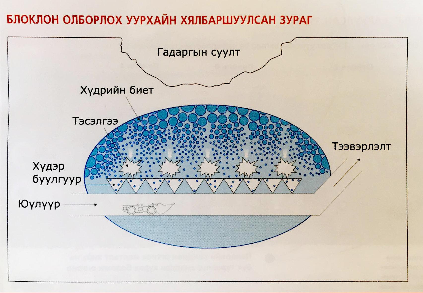 Тухайлбал, блок буюу хүдрийн биетийн доод хэсэгт малталт хийж, өрөмдөж тэслэх замаар блокийг нураан олборлоно гэсэн үг. Аварга хэмжээтэй юүлүүр, хонгилын сүлжээг энэхүү блокийн дор инженерийн нарийн ур ухаан сийлж байгуулна. Блок чулууг тэсэлж зайлуулснаар том хэмжээний орон зай үүсэх тул хүдрийн биет аажмаар хүндийн жингээрээ тухайн орон зай руу нуран орж ирж шууд утгаараа хүдрийн биет өөрөө хонхойж эхлэнэ гэсэн үг. Нурж буй хүдрийн биетийн дор тосох юүлүүр урьдчилан барьсан байх бөгөөд түүн рүү гулсан орж ирэх хүдрийг хонгилооор тээвэрлэн газрын гадарга руу зөөвөрлөнө. Хүдрийн биетийн нуралт дээшлэн ахисаар тухайн орчин буй газран гадаргад аажмаар суулт үүсгэж эхэлдэг. Хүдрийг бүрэн олборлож дуустал энэхүү агуйлсан орон зайнаас олон жилийн туршид малтана. Эдгээр агуйлсан орон зайн блок хүдрийн биет аврага том хэмжээтэй. Ойролцоогоор нэг блок 300x300 метрийн хэмжээтэй, 500 орчим метрийн өндөртэй. Энэ нь Сүхбаатарын талбайг бараг хоёр дахин нийлүүлсэнтэй, Шангри-ла барилгыг зургаа давхарласантай тэнцэх өндөр гэсэн үг аж. Тиймээс гүний уурхайг нэг л эхлүүлсэн бол зогсоох ямар ч аргагүй. Оюу толгойн гүний уурхайн хонгил 1400 метр, 2100 он хүрэл малтах арвин нөөцтэй. Монголчуудыг үеийн үед тэжээх хангалттай баялаг гэдэг нь эндээс харагдаж байгаа юм.