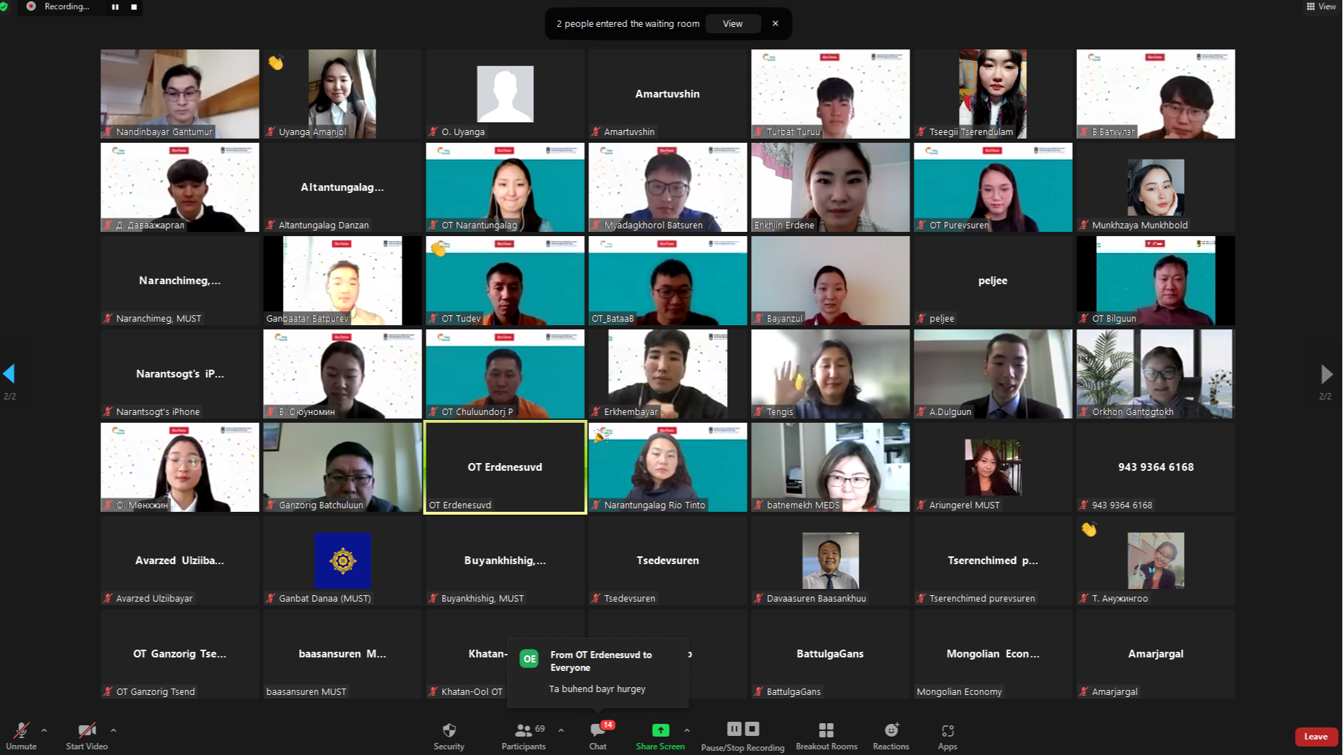 “Оюу толгой” болон “Рио Тинто” компани 2021-2022 оны хичээлийн жилд тэтгэлгээр суралцахаар шалгарсан 31 оюутанд батламж гардуулах цахим ёслол болсон юм. ХАБ-ийн ажиллагаагаар тэргүүлэгч “Оюу толгой” болон “Рио Тинто” компанийн зүгээс цахим ёслолын өмнө Улсын онцгой комиссоос чиглэл болгосны дагуу халдвар хамгааллын дэглэмийг танилцуулснаар эхэлсэн юм. Цахим ёслолд Шинжлэх ухаан, технологийн их сургуулийн ректор Б.Очирбат, БСШУЯ-ны Дээд боловсрол хариуцсан ахлах шинжээч Г.Батнэмэх, “Оюу толгой”компанийн боловсон хүчин, бүтэц зохион байгуулалт хариуцсан ерөнхий менежер Milissa, “Рио тинто” компанийн Монгол дахь үйл ажиллагаа хариуцсан захирал Х.Амаржаргал тус сургуулийн эрдэмтэн багш нар, оюутны төлөөлөл оролцсон юм. Б.Очирбат нээж хэлсэн үгэндээ “ 2021 оны дөрөвдүгээр сард “Оюу толгой” болон “Рио Тинто” компанийн ШУТИС-тай хамтарсан Геотехникийн хөтөлбөрт гарын үсэг зурж баталгаажуулснаар оюутнуудад болон судалгаа шинжилгээний ажилд тэтгэлэг олгох ажил ийнхүү амжилттай хэрэгжиж байна. “Оюу толгой” компани 2010 оноос эхлэн жил бүр манай сургуулийн олон оюутнуудад тэтгэлэг олгосоор ирснийг тэмдэглэн хэлэхэд таатай байна. Энэ жилийн тухайд Геотехникийн ангийн есөн оюутан хүртэж байгаад баяртай байна. Түүнчлэн геотехник гэсэн шинэ мэргэжлийг бий болгож уул уурхайн олон улсын стандартыг нэвтрүүлэхэд түлхэц болж цаашид олон улсын магадлан итгэмжлэгдсэн төсөл болгох зорилттой ажиллаж байгаа. Төсөл зөвхөн оюутнуудад тэтгэлэг өгөөд зогсохгүй эрдэмтэн судлаач багш нарыг мэргэшүүлэх, дэмжлэг үзүүлэх, сургалтын орчин үеийн геотехникийн сургалт, судалгааны лаборатори байгуулж байгаа гээд олон талт ач холбогдолтойг дурдахад таатай байна” гэв.