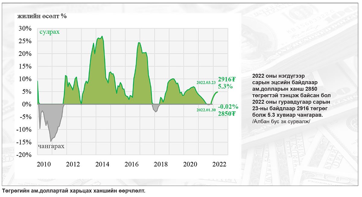 Төгрөгийн ханш ам.долларын эсрэг суларч өчигдрийн Монголбанкны ханшаар ам.доллар 2916 төгрөгтэй тэнцэж 3000 руу дөхөж байна. Энэ оны нэгдүгээр сарын эцсээр “ногооны”, төгрөгтэй харьцах ханш 2850 төгрөгтэй тэнцэж байсан юм. Энэ нь Орос, Украины дайнаас өмнөх ханш. Тэгвэл дайн эхэлснээс хойш дээрх ханшийн зөрүү албан бусаар бол 5.3 хувиар чангарсан бол сүүлийн гурван долоо хоногийн турш ам.долларын ханш төгрөгийн эсрэг 2.2 хувиар чангараад байна. Гэхдээ энэ чангаралт байж болох өсөлт гэж Төвбанк үзэж байгаа юм.