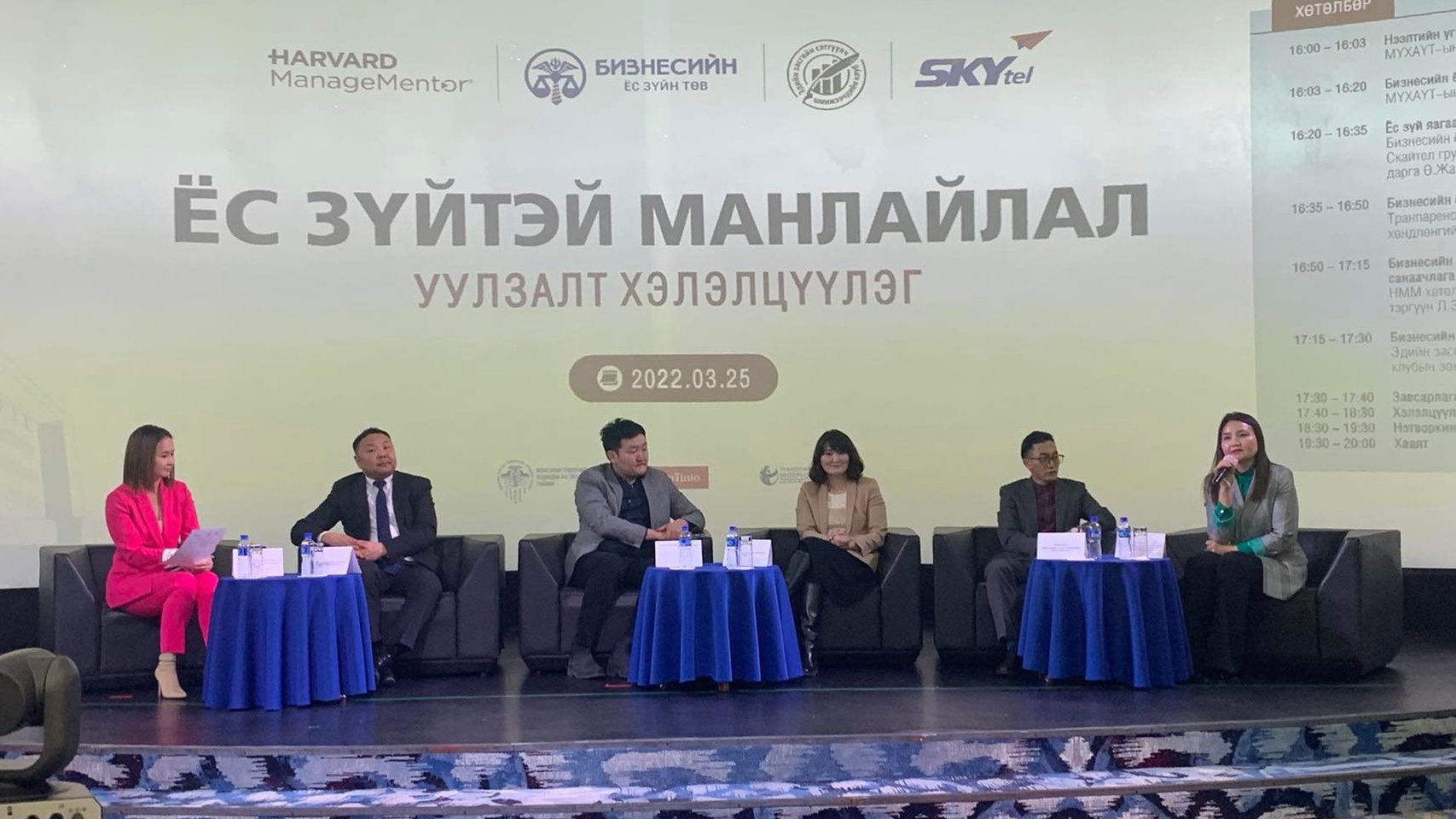 Төслийн явцад томоохон компаниуд бизнесийн ёс зүйн код болон хэрэгжүүлж буй ажлаа бусаддаа хуваалцдаг. Энэ удаад “Рио Тинто Монгол”, “Скайтел” болон “МАК” групп, Бизнес академи, Транспэрэнси интернэшнл Монгол ТББ-ын зөвлөх нар оролцож “Скайтел” группийн туршлагыг сонсож хэлэлцүүлэг өрнүүлсэн юм. Энэ оны эхний нэтворкинг уулзалтад Харвард менежментор хөтөлбөрийн төгсөгчид болох 30 гаруй компанийн захирал, Эдийн засгийн сэтгүүлч, шинжээчдийн клубын сэтгүүлчид оролцсон юм. “Рио Тинто Монгол” компани нь бизнесийн орчинд шударга, ил тод, нээлттэй үйл ажиллагааг дэмжиж, бизнесийн ёс зүй, шударга байдлыг бэхжүүлэх, зорилгоор энэ төсөлд санхүүгийн дэмжлэг үзүүлэн оролцож буйг тус компанийн хамтын ажиллагаа, гадаад харилцаа хариуцсан захирал Б.Даваасүрэн тодотгож байв. “Транспэрэнси интернэшнл Монгол”ТББ-ын хөндлөнгийн зөвлөх Д.Тэгшбаяр олон улсын туршлага “Мэхлэлтийн гурвалжин” гэсэн сонирхолтой илтгэл тавьсан юм. Түүнчлэн Харвард менежментор хөтөлбөрийн төгсөгчдийн холбооны тэргүүн Л.Загдаа “ Бизнесийн ёс зүй ба удирдлагын манлайлал санаачилга, Эдийн засгийн сэтгүүлч, шинжээчдийн клубын зохицуулагч Б.Баяртогтох “Бизнесийн ёс зүйг нийтлэхүй” сэдвээр илтгэл тавьж “Ёс зүйтэй манлайлалд нэгдэхээ илэрхийллээ.