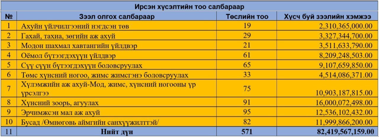 Хүсэлтийг цахим системээр 30 хоногийн хугацаанд амжилттай хүлээн авчээ. Цахим системд нийт 867 аж ахуйн нэгж 105 тэрбум 401 сая төгрөгийн зээлийн хүсэлт ирүүлэхээр хандсан. Үүнээс 571 аж ахуйн нэгж, 82 тэрбум 419 сая төгрөгийн зээлийн хүсэлтээ баталгаажуулсан байна. Журамд заасны дагуу борлуулалтын орлогоос хамааруулан зээл хүсэх дээд хэмжээг заасан бөгөөд 571 аж ахуйн нэгжийн 82 тэрбум 419 сая төгрөгийн зээлийн хүсэлтээс 63.9 хувь нь 100 хүртэл сая төгрөгийн зээл байна гэж Жижиг, дунд үйлдвэрийн газраас мэдээллээ.