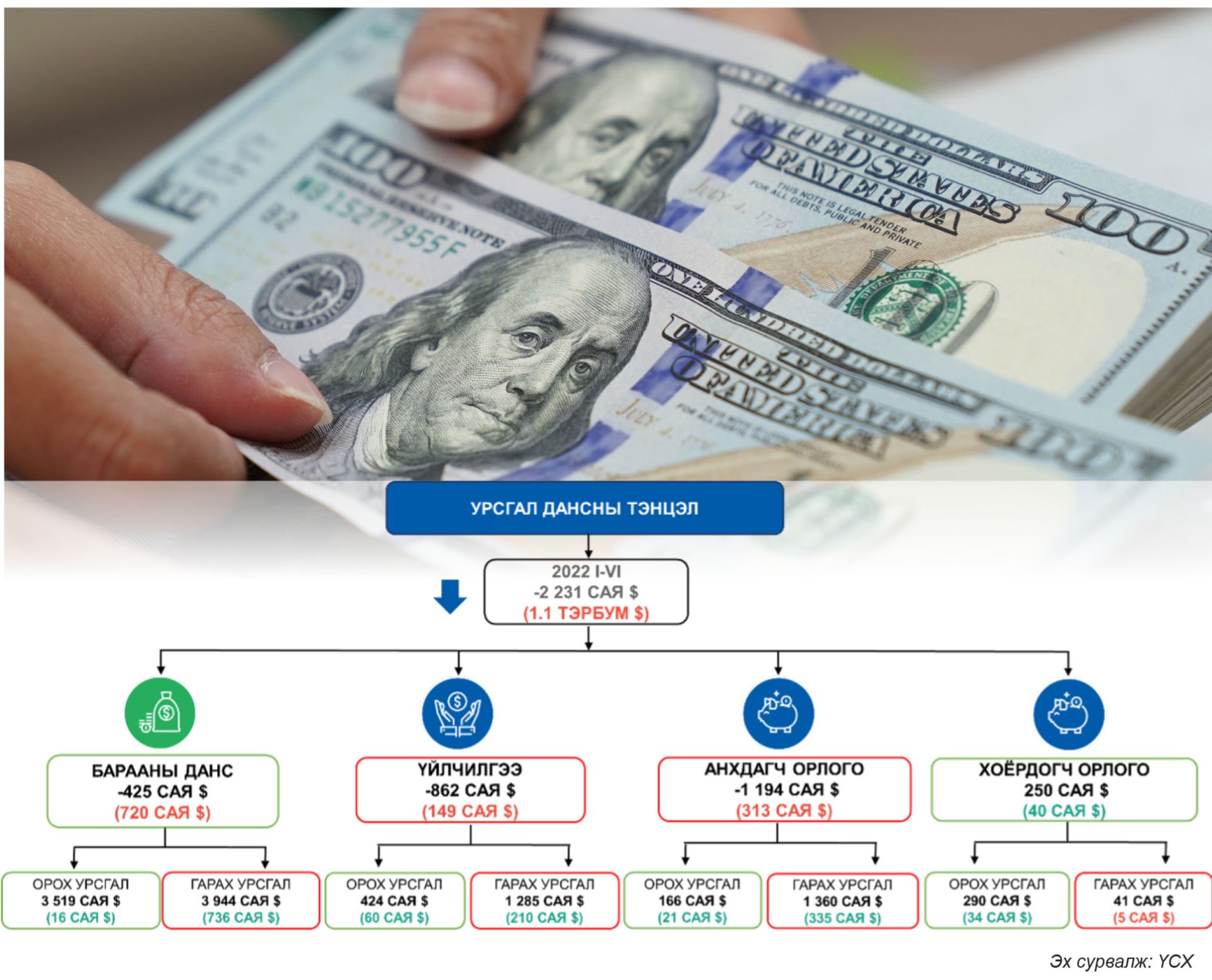 Энэ оны нүүрсний экспорт төлөвлөсөн хэмжээнд арай гэж хүрсэн. Ингэснээр төлбөрийн тэнцлийн алдагдал он гарсаар 1.6 тэрбум ам.долларт хүрээд байна. Энэ нь импортын өсөлтөд нөлөөлж урсгал дансны үйлчилгээний зардлын алдагдлыг нэмэгдүүлээд зогсохгүй валютын нөөцөд дарамт үүсгээд байгаа юм. Мөн тавдугаар сараас хойш нүүрсний тээвэр сэргэсэн ч өнгөрсөн онуудын оргил үеийн хэмжээнд хүрээгүй байгаа зэрэг нь төлбөрийн тэнцлийн алдагдлыг нэмэгдүүлэх нэг нөхцөл болжээ. Өөрөөр хэлбэл, 1.6 тэрбум ам. долларын дийлэнх нь буюу 880 сая ам.долларыг үйлчилгээний салбарт гадагшаа алдсан байна. Тодруулбал, уул уурхайн нүүрс тэээвэрлэгч хятад компаниудын тээврийн зардалд 448 сая ам. доллар. Монголчуудын гадаад руу аялах, боловсрол эзэмших, эмчлүүлэх зардалд 390 сая ам.доллар зарцуулагджээ. Үүний 226 сая ам. доллар нь боловсролд, 27 сая ам.доллар нь эмчилгээнд харин гадагшаа аялал жуулчлалд 134 сая ам.доллар буюу нийт 330 сая ам.доллар болж байна. Мөн олон улсын санхүүгийн төлбөр тооцооны үйлчилгээ, интернэтийн сүлжээ техникийн болон зөвлөх үйлчилгээний зардалд 420 сая ам.доллар зарцуулсан байна. Энэ мэт үйлчилгээний салбарын өндөр зардал төлбөрийн тэнцлийн алдагдлын 1.3 тэрбум ам. долларыг эзэлж улмаар гадаад валютын нөөцөд дарамт үзүүлж ханшийг савлуулж байна. Түүнчлэн энэ онд 20 орчим сая тонн нүүрс экспортлохоор төлөвлөсөн ч өнгөрсөн долоон сарын хугацаанд 11 сая тонн нүүрс гаргаад байгаа. Үлдсэн дөрвөн сарын хугацаанд тал нүүрсээ гаргаж амжихгүй бол дээрх алдагдал нэмэгдэхээр байгаа юм. Нөгөөтэйгүүр, бодлогын хүүг дахин чангаруулснаар инфляц одоо байгаа 15.7 хувьд тогтворжино. Улмаар нүүрсний экспорт нэмэгдсэнээр төлбөрийн тэнцлийн алдагдал саараах хүлээлт бий гэж албаны хүн ярьж байна. Энэ оны зургадугаар сарын 30-ны байдлаар 5.3 сая ам.долларын экспорт , 4.9 сая ам.долларын импорт хийсэн ч 1.6 тэрбум ам.долларын алдагдалтай байна. Манай гадаад валютын нөөц өнгөрсөн сарын 31-ний байдлаар 2.8 сая ам.доллар байна.