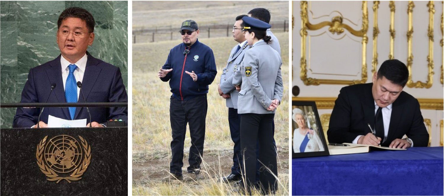 Ерөнхийлөгч У.Хүрэлсүх өнгөрсөн долоо хоногт НҮБ-ын Ерөнхий Ассамблейн 77 дугаар чуулганы Ерөнхий санал шүүмжлэлд оролцсон. УИХ-ын дарга Г.Занданшатар Дархан, Сэлэнгийн бүс нутагт ажиллав. Харин Ерөнхий сайд Л.Оюун-Эрдэнэ долоо хоногийн эхэнд ИБУИНХУ-ын Цог Жавхлант Хатан хаан II Элизабетыг үдэх төрийн оршуулгын ёслолд оролцлоо.