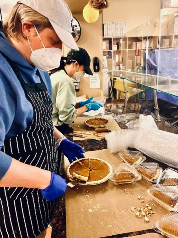 Талархлын баярыг тохиолдуулан Меган Маркл Лос-Анжелес хотын төвийн эмэгтэйчүүдийн төвтэй хамтран ажиллаж, 300 гаруй орон гэргүй эмэгтэйд үнэ төлбөргүй баярын хоол бэлтгэх ажилд биечлэн оролцсон байна. Арчевеллийн албан ёсны вэбсайтаас авсан зурагт гүнгийн авхай бусад сайн дурынхны хамт уламжлалт хулуутай бялууг хэрчиж, саванд хийж байна.