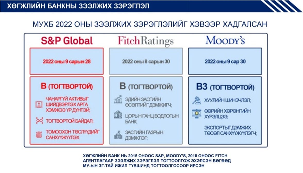2022 оны эхэнд 1.3 хувь байсан өөрийн хөрөнгийн хүрэлцээний үзүүлэлт өнөөдөр 14.9 хувьд хүрч зохистой түвшинд хүрч банк дампуурах эрсдэлээс гарлаа. Мөн энэ онд олон улсын зээлжих зэрэглэл тогтоогч байгууллагууд болох S&P, Fitch, Moody’s агентлагууд Хөгжлийн банкны зээлжих зэрэглэлийг шинэчлэн тогтоохоор ажилласан ба эдгээр гурван байгууллага гурвуулаа Хөгжлийн банкны зээлжих зэрэглэлийг B тогтвортой буюу өмнөх зэрэглэлтэй адил түвшинд хэвээр хадгалсан. Хөгжлийн банк зээлжих зэрэглэлээ хэвээр хадгалснаар цаашид дахин санхүүжилт авах, шинэ санхүүжилтийн эх үүсвэрүүдийг татан төвлөрүүлэх, гадаад хамтын ажиллагааг өргөжүүлэх алхмыг энэ онд тавьж чадлаа.