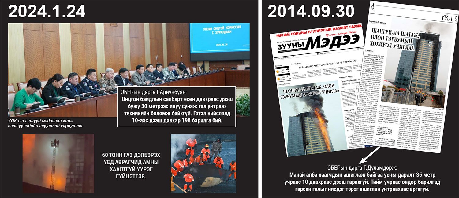 2014 оны есдүгээр сарын 30-нд буюу одоогоос 10 жилийн өмнө "Шангри-Ла"-д гал гарч онцгойгийнхон аюулт галыг гар "хоосон" сөрж байв. Энэ талаар "Зууны мэдээ" сонин тухайн үед сурвалжилж байсан билээ. Гэтэл өчигдөр мөн л орон сууцны барилгад гал гарахад техник хэрэгслийн асуудал дахин хөндөгдөв. Энэ үеэр Шадар сайд болон ОБЕГ-ын удирдлагууд 10 жилийн өмнөх нөхцөл байдлаа ярьсаар л байв. Тодруулбал, 2014 онд өндөр барилга өөд "өгсөх" шат дутагдалтай байсан бол өнөөдөр мөн л есөн давхраас дээш барилгын түймэр унтраах багаж байхгүй хэвээр л байна. Харин хэзээ 10-аас дээш давхар барилгыг бүрэн аюулгүй болгох багаж төхөөрөмжтэй болох вэ гэдэг нь тодорхойгүй байна.