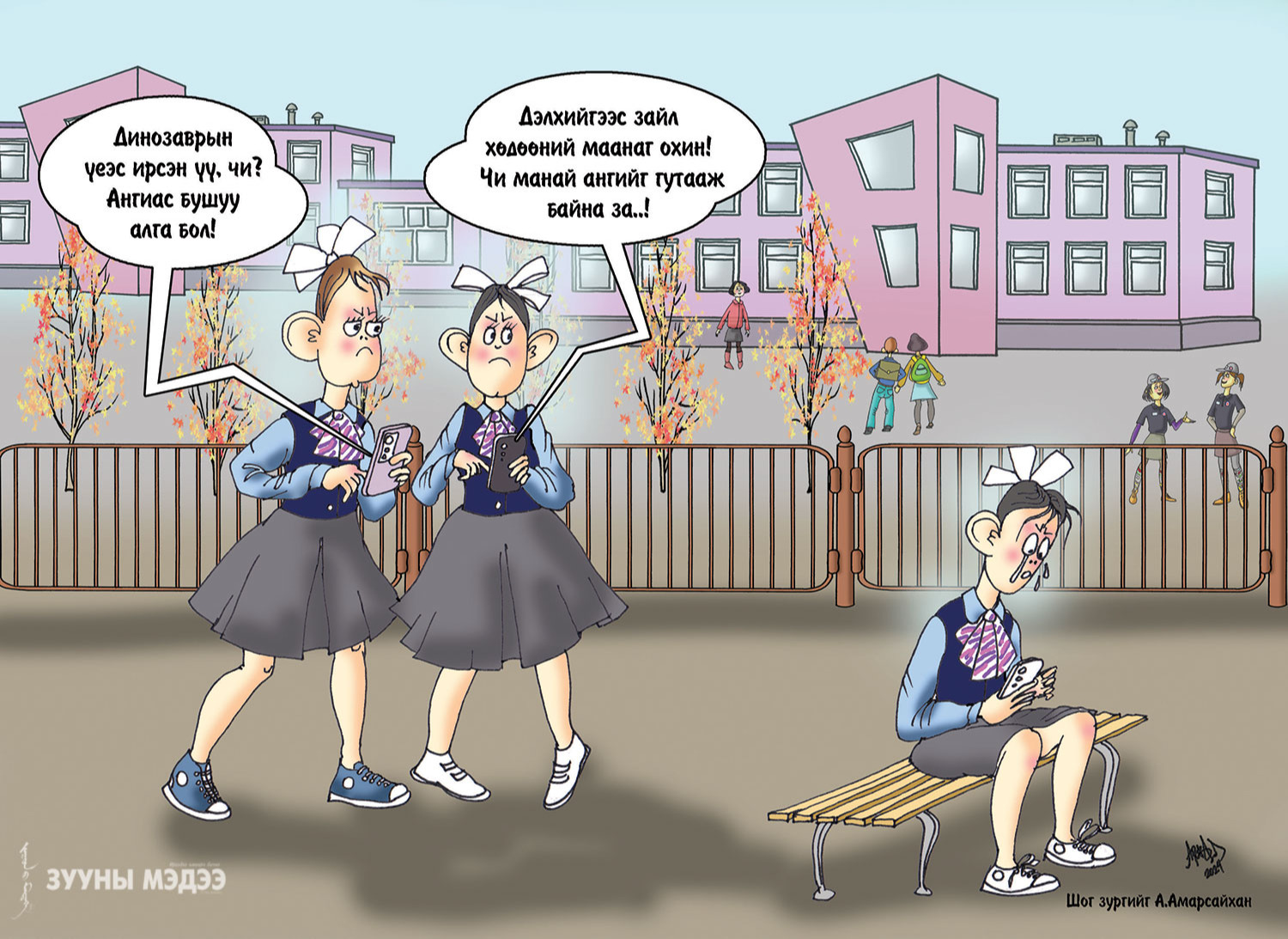 Өнөөдөр бид мэдээллийн эрин зуунд амьдарч, зогсоо зайгүй хөврөх мэдээлэл дунд “төөрч” байгаа. Үүнээс гадна гэр бүлийн халуун дулаан харилцаа биднээс алсран одож, хоолны ширээний ард хоорондоо чаатаар харилцах хэмжээний аюулын ангалд ирээд байна. Тиймээс цахим дээрэлхэлт, хүчирхийлэл өдрөөс өдөрт ихсэж байгаад эцэг эх бидний буруу ч бий. Сошиал орчинд хэн нэгнийг доош нь хийсэн элдэв бичлэгийг завсар зайгүй үзэж, түгээж, үр хүүхдэдээ буруу үлгэр дуурайл үзүүлж байгаа нь үнэн. Таны хүүхдийн сэтгэл зүй өнөөдөр ямар байгааг анзаарч нэг хараарай. Магадгүй цахим дээрэлхэлтэд өртөөд, сэтгэл гутралд орчихсон юм биш биз. Мөн үеийн найзаа дээрэлхэх, биед нь гэмтэл учруулах, цахимаар дарамтлах зэрэг нь гэр бүлийн хүмүүжилтэй шууд холбоотой гэж 93 дугаар сургуулийн 8а ангийн эцэг эхийн төлөөлөл хэлж байв . Энэ тухай Нийслэлийн Ерөнхий боловсролын 67 дугаар сургуулийн эцэг эхийн төлөөлөл “Өнгөрсөн жил манай хүүхдийн чихний хэнгэрэг нь хагарсан. Шалтгаан нь ангийнхаа найзтай маргалдсан юм билээ. Яагаад маргалдсан бэ гэхээр тэр хөвгүүн миний хүүгийн итгээд ярьсан хувийн нууцыг ангийнхаа групп чаатад дэлгэсэн байсан. Үе тэнгийн хөвгүүд муудалцахыг алийг тэр гэхэв. Гэхдээ нэр хүндэд нь халдахаас эхлээд чихний хэнгэрэгийг нь цоортол цохино гэдэг байж болохгүй асуудал. Би хуулийн байгууллагад хандсан. Тухайн хүүхдийн аав ээжийг дуудаж уулзах гэтэл ээж нь байхгүй, аав нь архины хамааралтай, эмээ дээрээ байдаг хүү байсан. Настай хүнтэй маргалдахыг хүсээгүй учраас миний хүү эрүүл мэндээрээ хохироод үлдсэн. Ер нь найзуудаа дээрэлхдэг, багшийнхаа үгэнд ордоггүй, хичээлээ тасалдаг хүүхдүүдийг ажаад байхад ихэвчлэн ар гэрийн хүмүүжил тааруу, амьдралын бололцоо доогуур хүүхдүүд байдаг юм билээ. Тэгэхээр эцэг эхчүүд бид хүүхдийнхээ өмнө хариуцлагатай байдаг баймаар байна. Гэр бүлийн халуун дулаан уур амьсгалд өссөн хүүхэд хэзээ ч хүнийг дээрэлхэе, дарамталъя гэсэн бодол гарахгүй” гэсэн юм. Харин тус сургуулийн сургалтын менежер “Ялангуяа хотоос алслагдмал гэр хорооллын сургуулиудад үе тэнгийн дээрэлхэлтийн асуудал гардгийг үгүйсгэхгүй. Манай хорооны хувьд гэхэд хагас болон бүтэн өнчин, аав ээж нь архины хамааралтай болчихсон, хүүхдээ хайхардаггүй асуудал байнга яригддаг. Өнөөх хүүхдүүд нь бусдын хүүхдийг дээрэлхэх, дээрэмдэх, эсвэл гадуурхах хандлагатай болчихсон. Багш нар нь сургачих гээд араас нь мянга гүйгээд эцэг эхийн оролцоо байхгүй бол ямар ч нэмэргүй. Хүний суурь хүмүүжил гэдэг насан туршийн боловсрол шүү дээ” гэсэн юм. Харин төвийн бүсийн сургуулиудын дунд гардаг нэг том асуудал нь утасны хэрэглээ гэж нэгдүгээр сургуулийн багш нар учирлаж байсан юм. Сурагчид өмссөн хувцас, барьсан утасныхаа дэвшлээр өрсөлддөг болоод уджээ. Үүнээс болж цахим хичээл ороход өөрийнхөө утаснаас ичээд гаргаж чадалгүй, хичээлээ таслах байдал ихэссэн гэж байв. Хөвгүүд нь өмссөн пүүз, охид нь үүрсэн цүнхээрээ хүртэл нэгнээ гадуурхдаг, доромжилдог нэгэн үе бидний дунд хүн болохоор суралцаж байна гээд та бод доо. Нийслэлийн лаборатори 93-р сургуулийн Нийгмийн ажилтан Ж.Энхжаргал “Хүүхдүүдийн дунд ялгаварлан гадуурхалт нь илүү материаллаг тал руугаа ажиглагддаг. Үнэтэй гар утас барьсан, үнэтэй пүүз өмссөнд нь илүү сайн ханддаг үзэгдэл тодорхой хэмжээнд бий. Бусдыг дээрэлхсэн хүүхдийг хүүхэд хамгааллын хуулиараа сургуулийн орчинд мэдээж шийтгэ