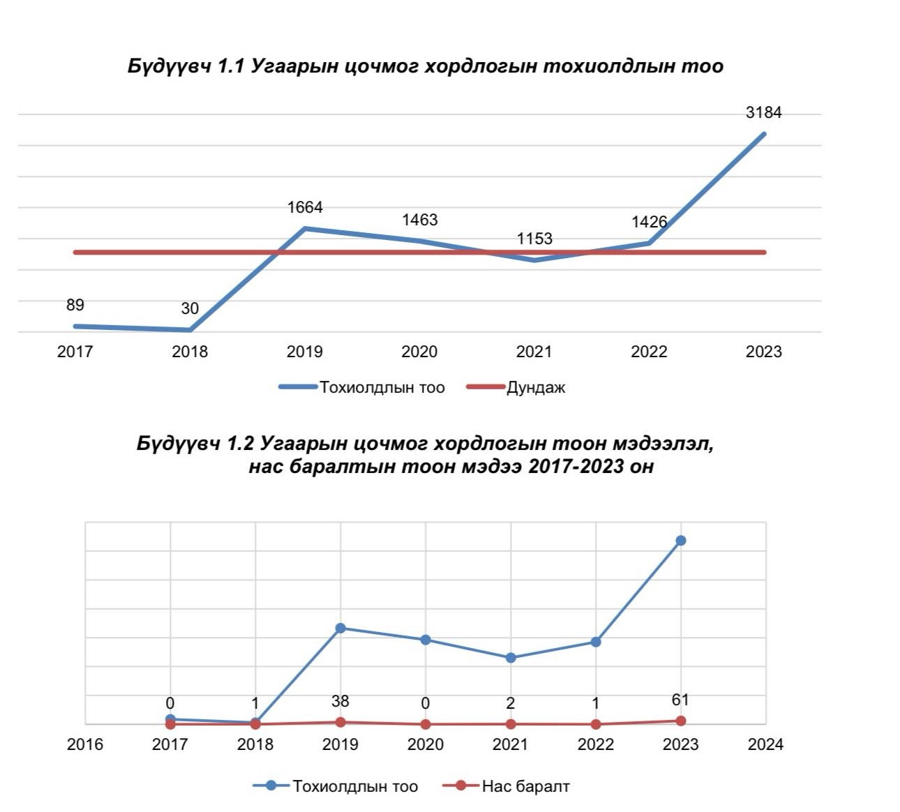 Харин 2017-2023 оны байдлаар 103 нас баралтын тохиолдол бүртгэгджээ. Харин 2024 оны эхний есөн сард 1579 иргэн угаарын хийн хордлогод өртөж, 31 иргэн нас барсан бол 2025 оны нэгдүгээр сараас өнөөдрийг хүртэл 1613  тохиолдол бүртгэгдэж, 110 хүн нас баржээ.