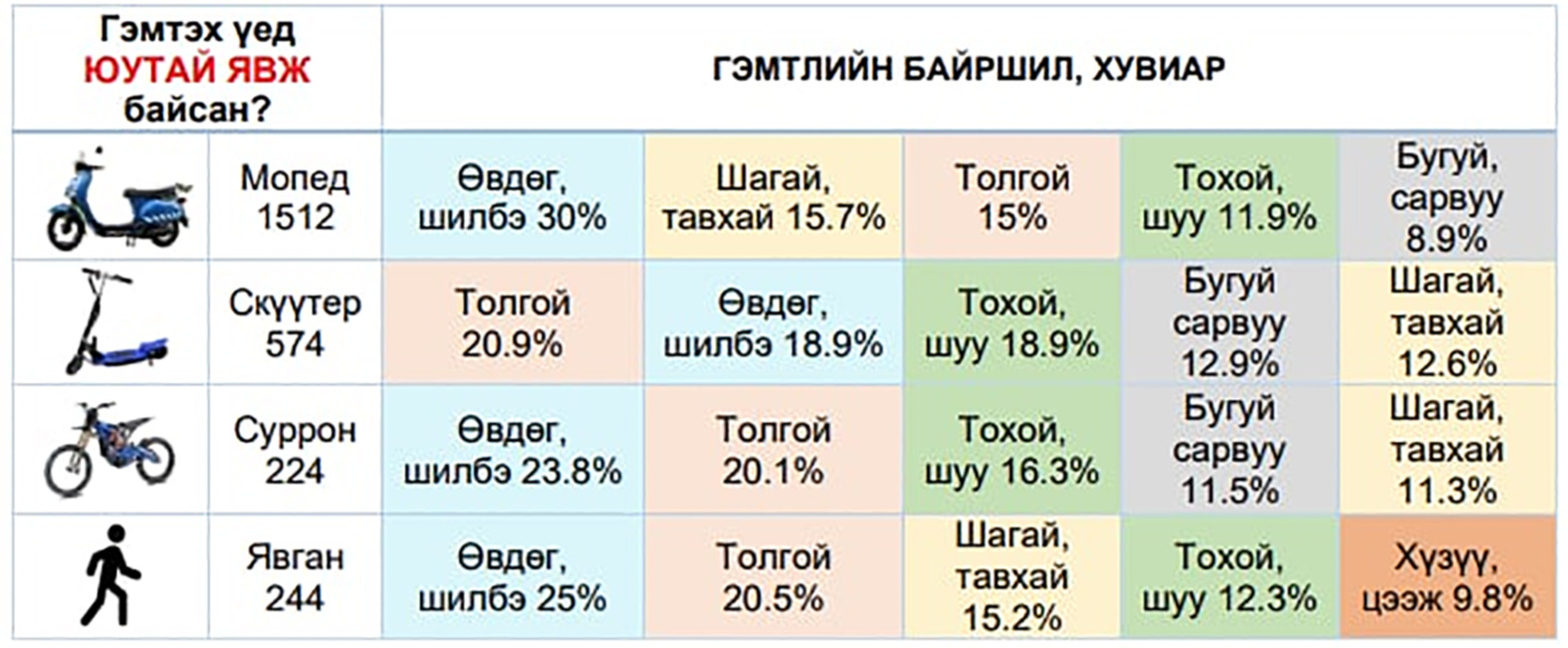 Улсын хэмжээнд 2025 оны байдлаар цахилгаан моторт бичил тээврийн хэрэгслээс үүдэлтэй 2792 осол гэмтлийн шинэ тохиолдол бүртгэгдсэний 2770 буюу 99.2 хувь нь ГССҮТ-өөс эмнэлгийн тусламж авсан байна. Энэхүү тоон үзүүлэлт 2024 оныхоос зургаа дахин нэмэгдэж, өнгөрсөн хоёр жилийн хугацаанд найман хүн нас барсан харамсалтай мэдээ бий. Тодруулбал, 2024 оны нас баралтын гурван тохиолдлын нэг нь 50 настай явган зорчигч байсан юм. Ингэхдээ скүтерт мөргүүлж, эмнэлэгт хэвтэн субдурал цус харвалтаар нас баржээ. Харин бусад тохиолдолд тээврийн хэрэгсэл жолоодож явахдаа унаж, онхолдож, суудлын машины араас мөргөж, автобустай мөргөлдөж, том машинд мөргүүлсэн шалтгааны улмаас гэмтэл авч, нас баржээ. Энэхүү 17-60 насны долоон иргэний дөрөв нь мопед, хоёр нь цахилгаан дугуй, нэг нь суррон унаж явсан бөгөөд нэг нь дугуйн зам, бусад нь авто замаар хөдөлгөөнд оролцож байхдаа амь насаа алджээ. Улаанбаатар хотын дэд бүтцийн төлөвлөлтөд унадаг дугуйн замыг хангалтгүй байгаагийн гор нь ийнхүү гарч байна.