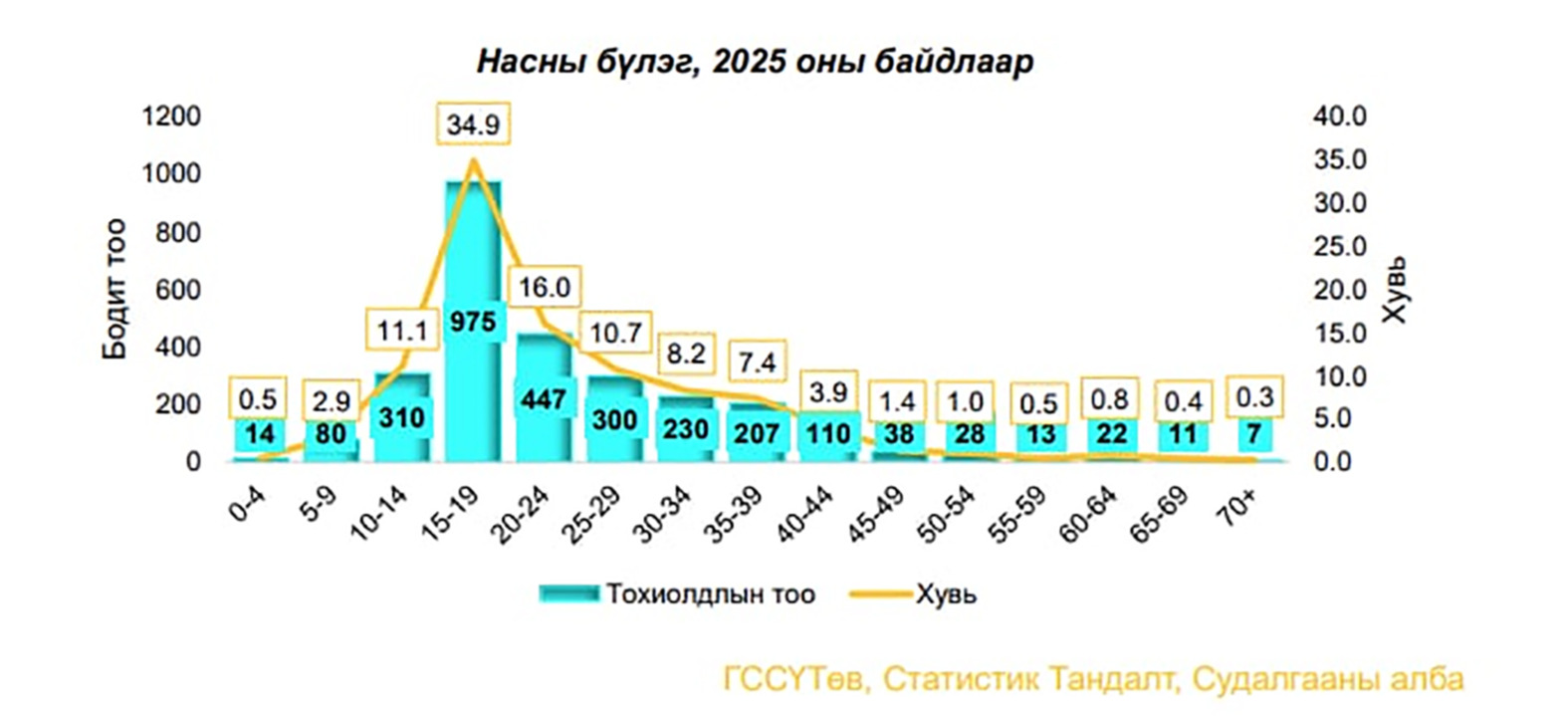 2025 оны нийт ослын 72 хувийг 10-29 насныхан эзэлж байгаа бөгөөд үүн дээр нарийвчлан тооцоолбол, 15-19 насныхан 34.9 хувь буюу 975 нь байна. Түүнчлэн 16 хувь буюу 447 тохиолдол нь 20-24 насныхан байгаа бол 10-14 насныхан 11.1 хувь буюу 310 тохиолдлыг эзэлж, улс орны ирээдүй болсон хүүхэд залуус эрүүл мэнд, амь насаараа хохирсоор байна. Цаашлаад, 68.3 хувь нь буюу 1907 нь эрэгтэй, 31.3% нь эмэгтэйчүүд байв.